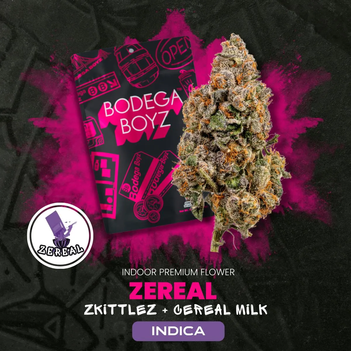 Step into the world of premium flavor and balanced effects with Bodega Boyz Zereal. Crafted from exclusive genetics by the cannabis connoisseurs at Bodega Boyz, this hybrid strain is a masterful cross between the creamy, delicious Cereal Milk and the tropically sweet Zkittlez.